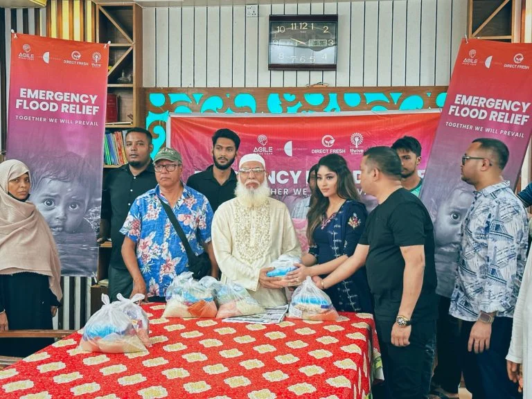 All of the relief donations were collected and stored at Direct Fresh Limited warehouse (a concern of Agile Mind Corporation) on Thursday evening, 7 pm, and on Friday they were sorted and packed into individual bags to be distributed to flood victims. Rice, dal, Orsaline, water purifying tablets, biscuits, cheera, jaggery and milk powder were in each bag, and a total of 1000 were distributed to Comilla Zilla School. Moreover, around fifty/50 life jackets were also specially sourced and donated upon their request. Sadia Mustari Karim, Director of Agile Minds Corporation handed over the relief in Comilla. Agile Minds Corporation MD, Mishal Karim, personally donated 3000 packets which are ready to be distributed on Sunday. Each packet contains dry food, emergency aid and feminine products and clothes to be distributed to Feni Zilla camp.